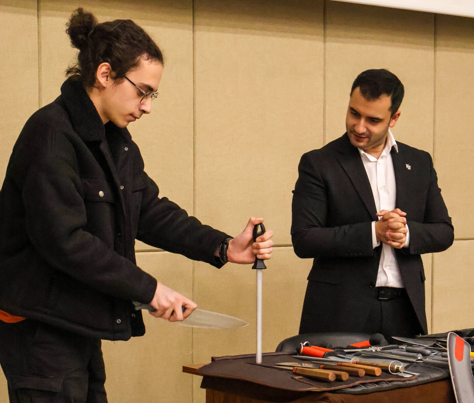 Öğrencilerimizin katılımları ile Turizm Fakültesi Konferans Salonu'nda gerçekleştirilen etkinlikte ERBİL; bıçağın yapısı, bıçak çeşitleri, HACCP sertifikalı mutfak gereçleri hakkında bilgi veren sunumunu gerçekleştirdi. Sunum sırasında öğrencilere sorular da yönelten ERBİL, doğru cevap veren öğrencilere bıçak hediye etti.